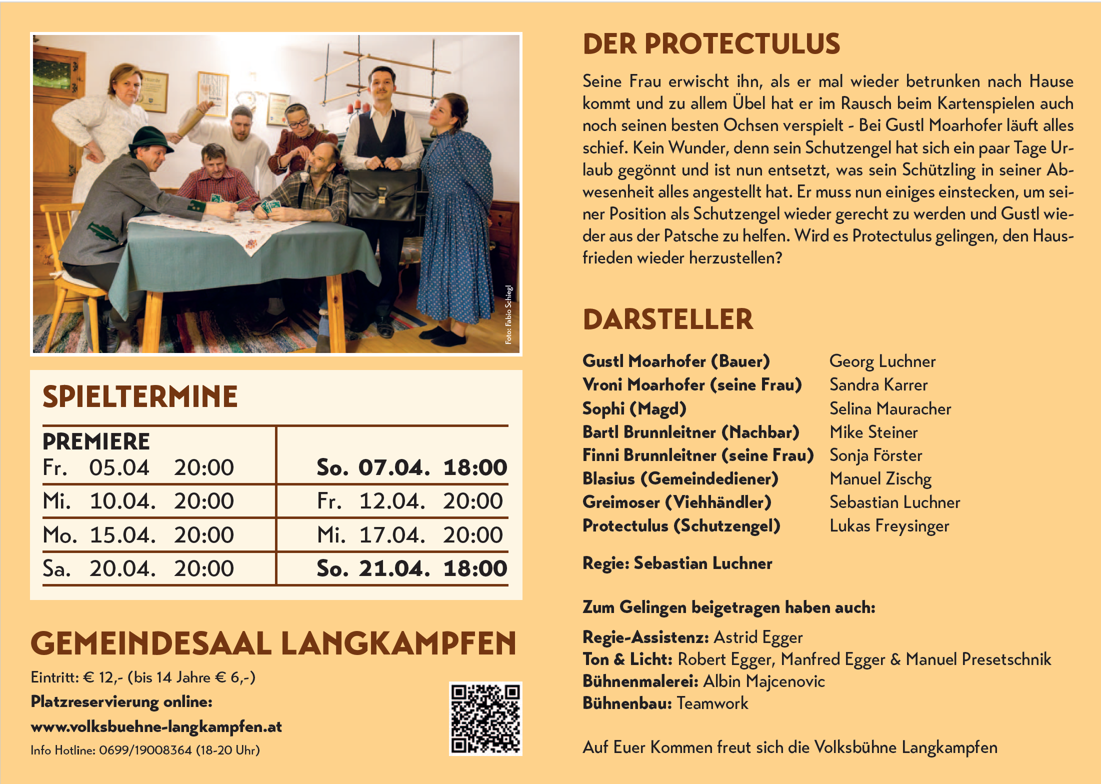 Seine Frau erwischt ihn, als er mal wieder betrunken nach Hause kommt und zu allem Übel hat er im Rausch beim Kartenspielen auch noch seinen besten Ochsen verspielt - Bei Gustl Moarhofer läuft alles schief. Kein Wunder, denn sein Schutzengel hat sich ein paar Tage Urlaub gegönnt und ist nun entsetzt, was sein Schützling in seiner Abwesenheit alles angestellt hat. Er muss nun einiges einstecken, um seiner Position als Schutzengel wieder gerecht zu werden und Gustl wieder aus der Patsche zu helfen. Wird es Protectulus gelingen, den Hausfrieden wieder herzustellen? Eine Komödie in 3 Akten von PeterLandstorfer.